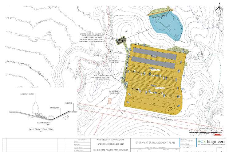 The diagram shows the existing and proposed poultry sheds on the property off Hill End Road – the three sheds with hatching marks are proposed to be redeveloped and the two to the south of those sheds are proposed to be constructed.