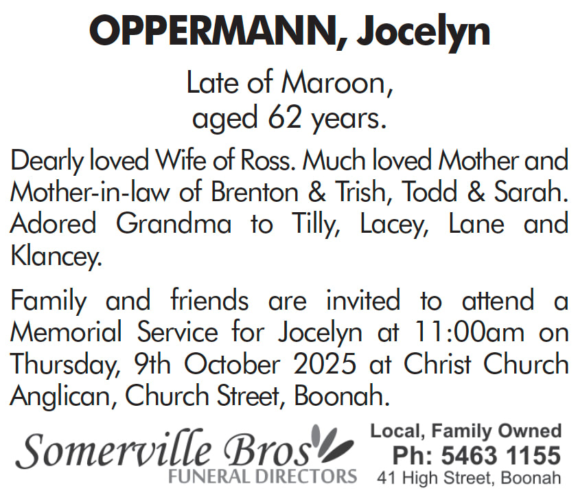 Funeral Notice OPPERMANN, Jocelyn Dearly loved Wife of Ross. Much loved Mother and Mother-in-law of Brenton & Trish, Todd & Sarah. Adored Grandma to Tilly, Lacey, Lane and Klancey Staff Writers 2 hours ago