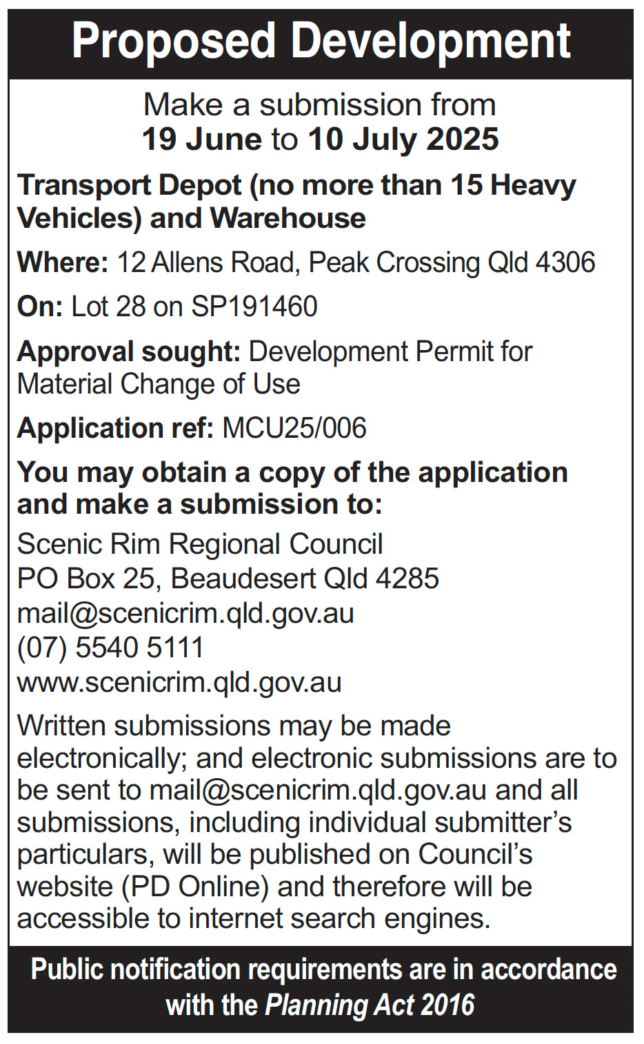 Make a submission from 23 October to 13 November 2025 Boundary Realignment (3 into 3 Rural Lots) Where: 606 Kruger Road and 52 & 66 Mundook Road, Coleyville Qld 4307 On: Lot 29 on RP218830,