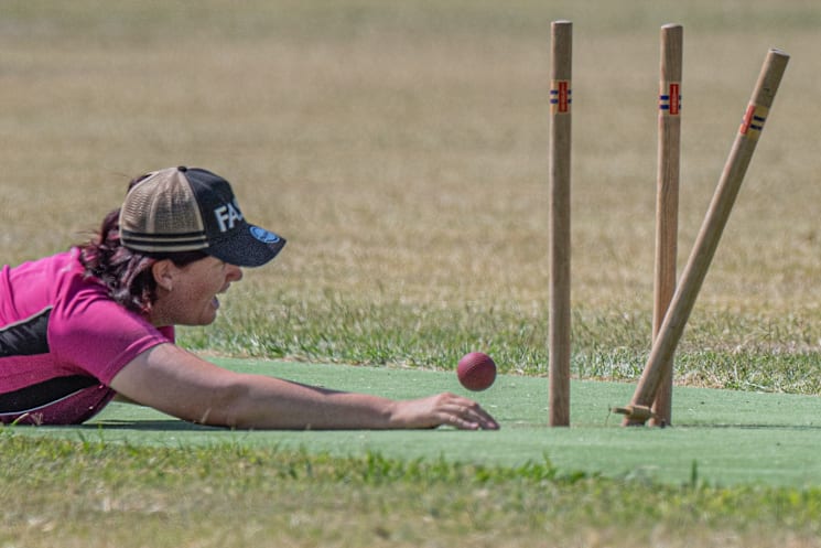 Determined Funtastics’ player Emma Gnech dives to make a run-out in her team's season-opening victory over Funtastics at Coronation Park. Photo: LYLE RADFORD